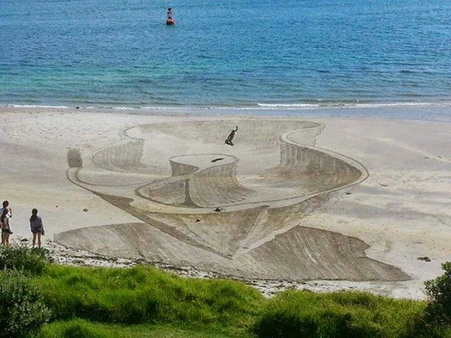 These art creations by Jamie Harkins are a kind of beach art. New Zealand based artist is professionally engaged in fine arts and music. These 3D-drawings on the sand are more like a hobby for him.