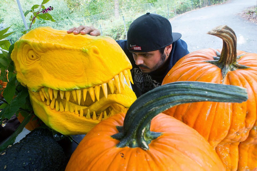 Sculptor Chris Vierra of the renowned Villafane Studios recently turned a large pumpkin into a lifelike replica of a Tyrannosaurus Rex's head at Field Station: Dinosaurs,